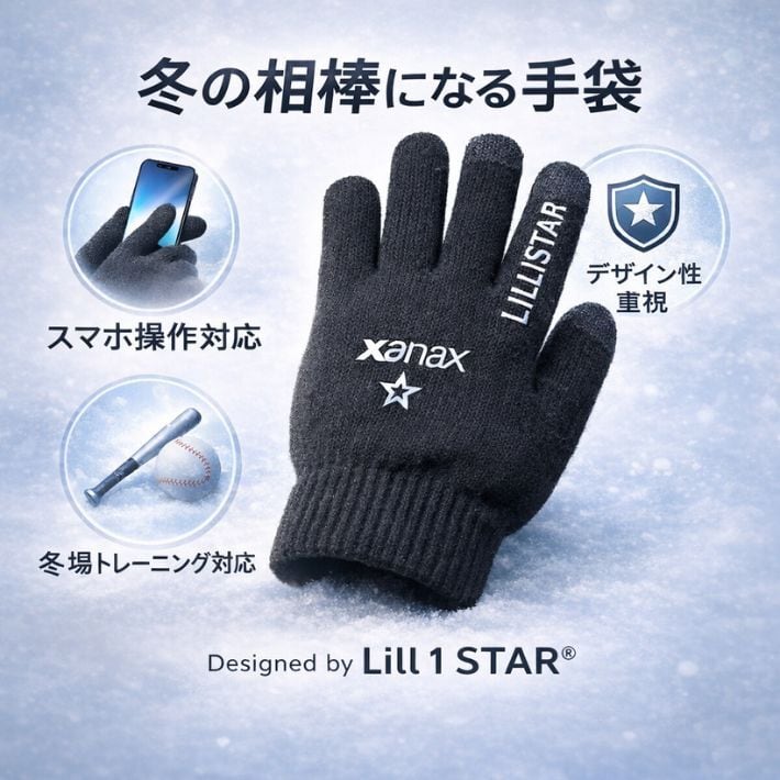 冬の野球練習、部活の移動、観戦、ゴルフやトレーニングの寒さ対策に。ザナックス「Designed by Lill 1 STAR?」コレクションのニット手袋は、防寒性と実用性に加え、デザイン性までこだわった一双です。