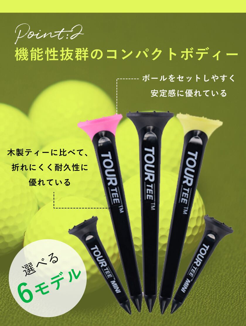 ツアーティーの製品開発は、ゴルフの様々な問題に直面してきた私たちの努力の結晶です。ロングティーは最大限の飛距離を引き出すために設計され、ショートティーはアイアンやフェアウェイウッドを使ったショットに最適です。これらのティーを組み合わせることで、ゴルフのプレーがさらに良くなるでしょう。