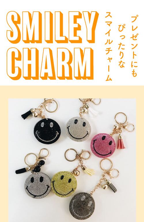 質感のいいキラキラと輝くラインストーンで彩られたスマイルモチーフのチャームリングです。