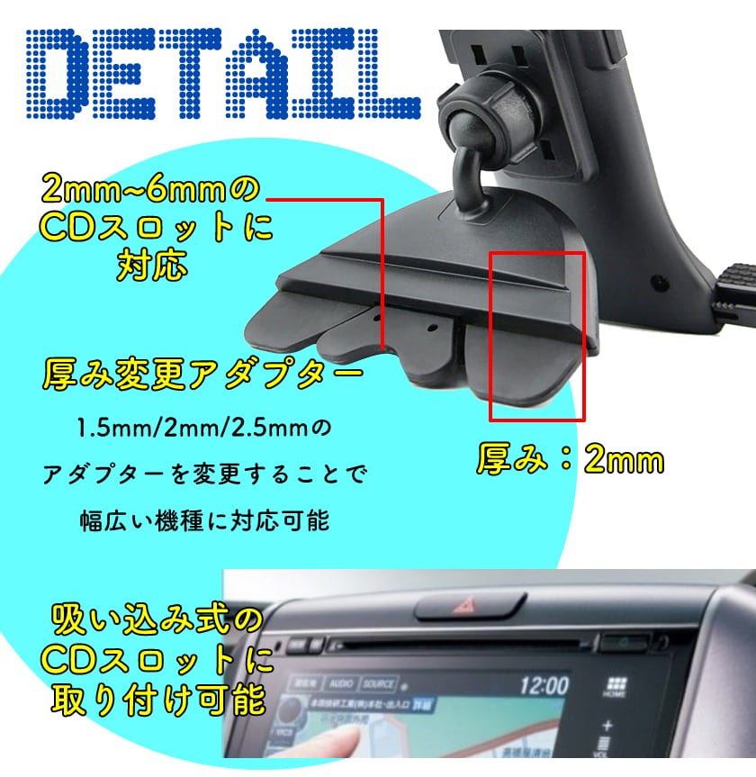 CDスロット厚み変更アダプター付きで装着後のぐらつきを軽減することができます。