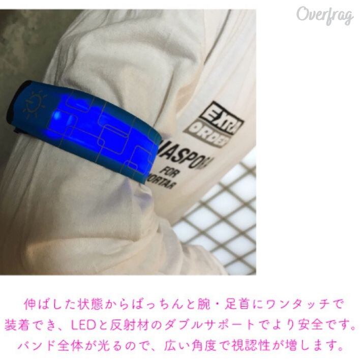 ●伸ばした状態からばっちんと腕・足首にワンタッチで装着でき、LEDと反射材のダブルサポートでより安全です。