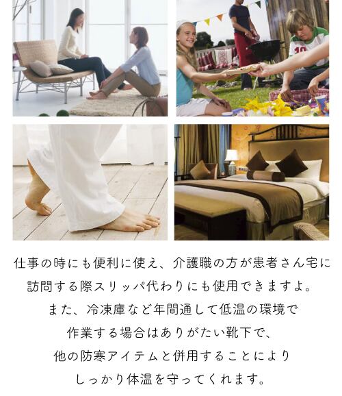 また、冷凍庫など年間通して低温の環境で作業する場合はありがたい靴下で、他の防寒アイテムと併用することによりしっかり体温を守ってくれます。