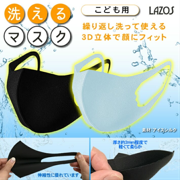 アイスシルク素材でひんやり、冷感やウイルス飛沫・ほこり・花粉をカットする、こども用と大人用の洗えるマスクです。