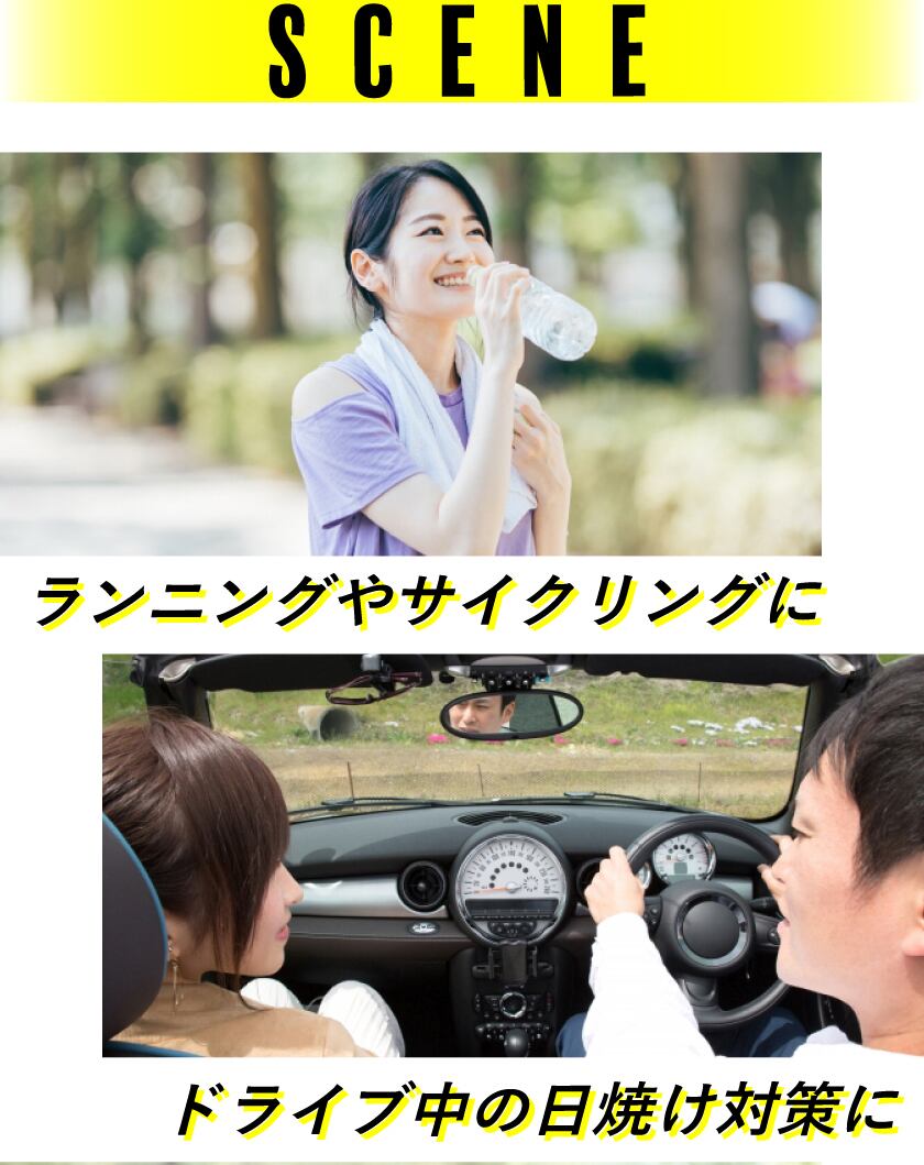 −3℃の冷感素材が猛暑による体力の消耗を防ぎ、アスリートの身体メンテナンスを手助けします。素材はUVカット率99.8%、UPF最高値の50+ と、日焼け対策にも大変効果的です。