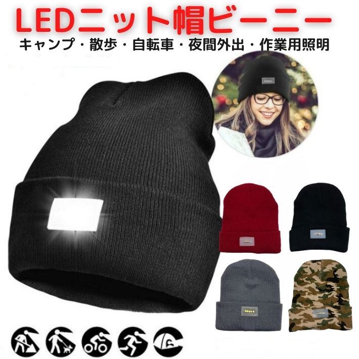 LEDライト ニット帽 ビーニー 帽子 キャップ 作業用帽子 LED電球 LED照明 ヘッドライト 懐中電灯 光る 夜間散歩 ランニング キャンプ アウトドア サイクリング 車 バイク 自転車 整備 照明 読書 防災対策 メンズ レディース おしゃれ プレゼント