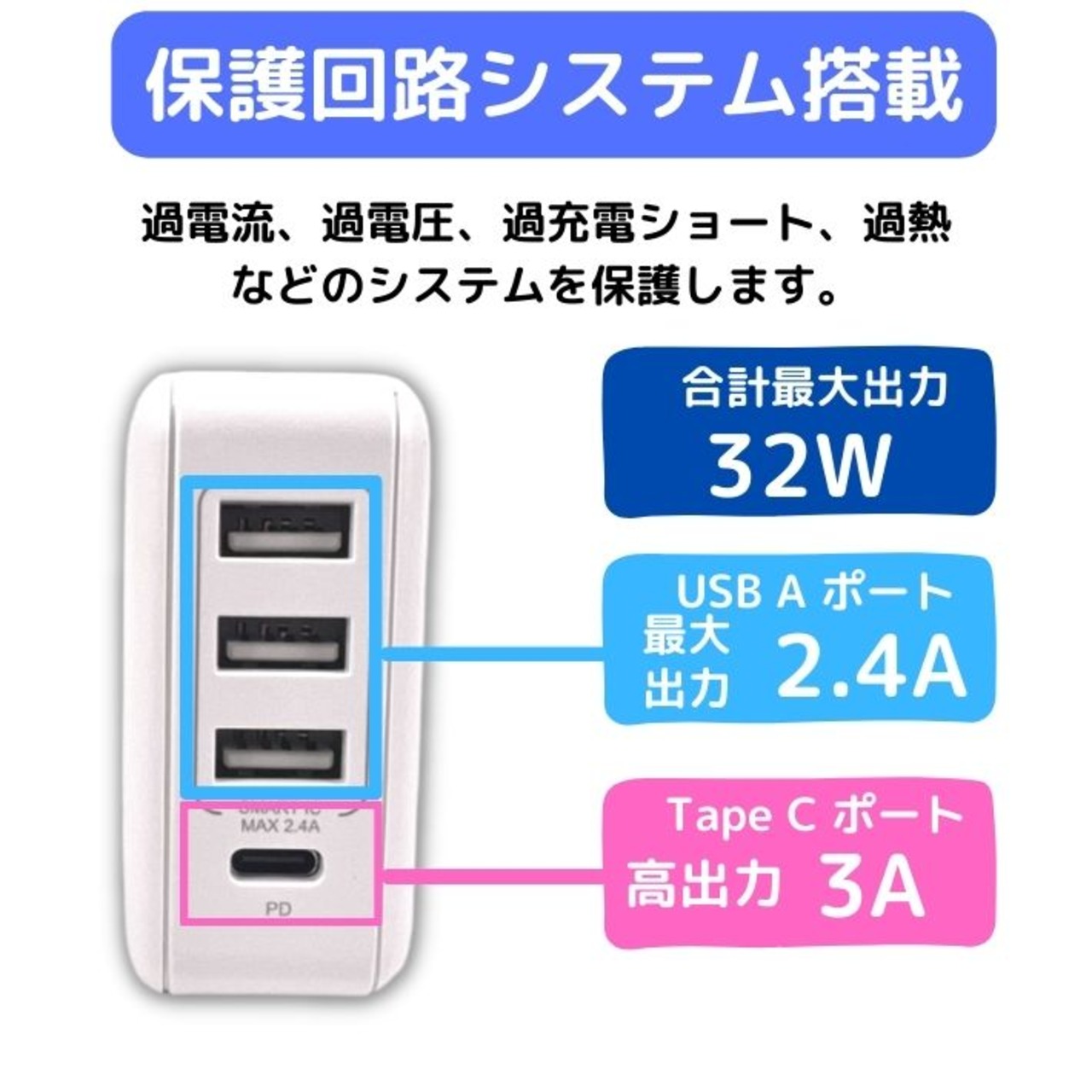 3台同時充電ケーブル 付き usb type-c 急速 ac 4台同時 充電 アダプター コンセント 一体型 家庭用AC L-AC4-W usbハブ iphone android galaxy oppo ipad タブレット 充電器 対応 acアダプター usb ac ギア 便利 グッズ アイテム 人気 最大32W コンパクト テレワーク 旅行 出張 お出かけ 持ち運び プレゼント 送料無料
