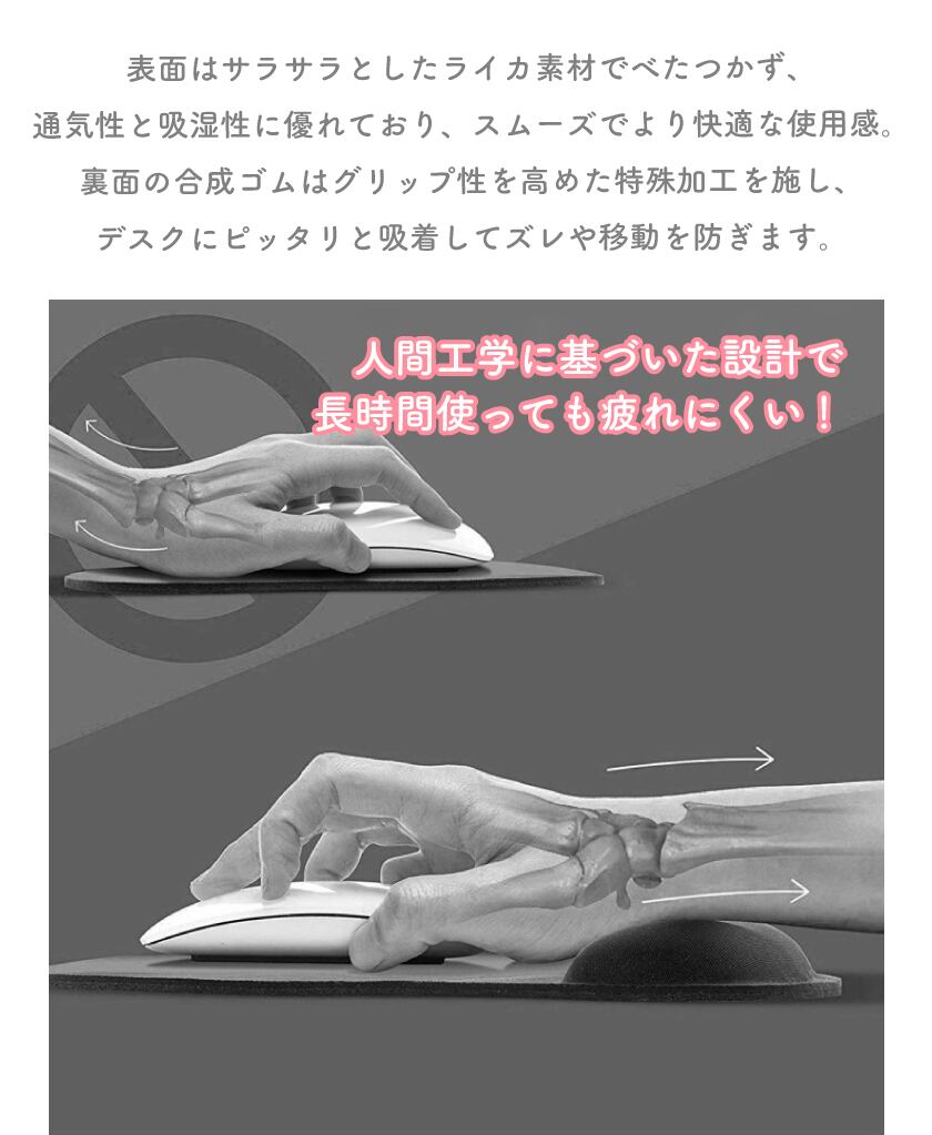 ・手首の接触ストレスを減らし、長時間のマウス操作により手首などにかかる負担を軽減し、疲労を抑えます。