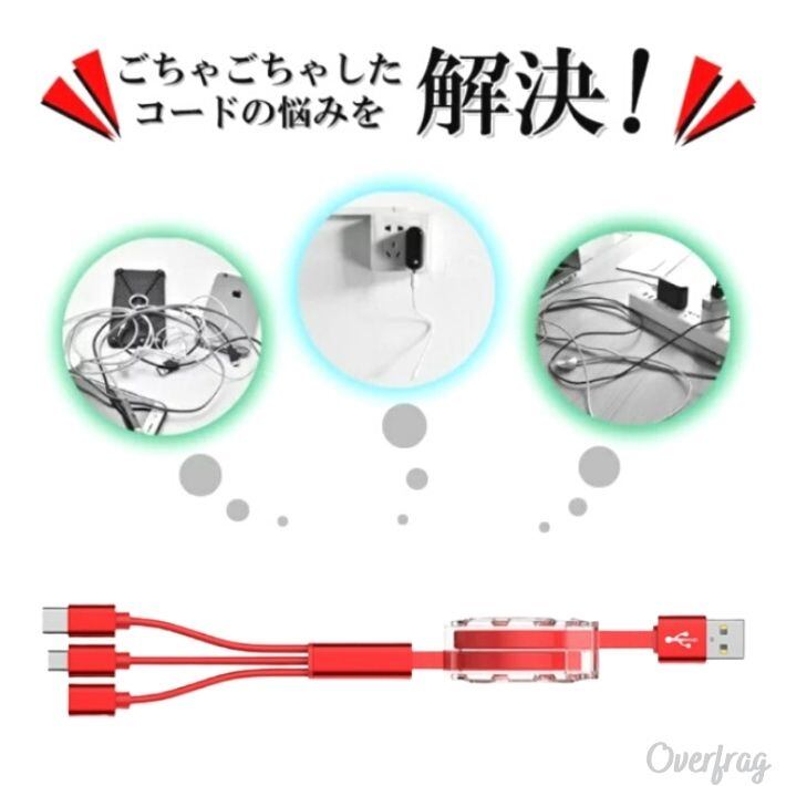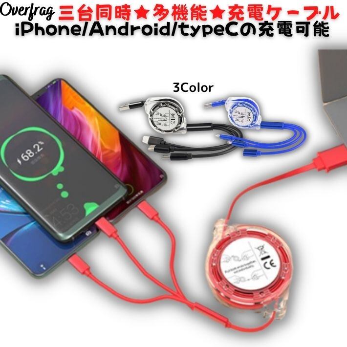 OverFrag 3台同時充電可 3in1 Micro usb type c 充電ケーブル コードリール式 急速充電 対応 旅行 便利グッズ ライトニング バッテリー用 充電コード android アンドロイド 便利 アイテム 出張 おしゃれ プレゼント コンペ 景品