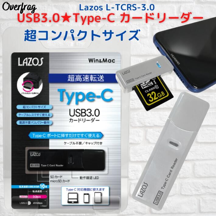【在庫限り】Lazos USB Type-C カードリーダー SD microSD 対応 usb3.0 キャップ ホワイト ブラック sdカードリーダー 高速転送 データー転送 OTG コンパクト カードリーダーライター マイクロ sd pc スマホ アンドロイド android Lazos L-TCRS-3.0