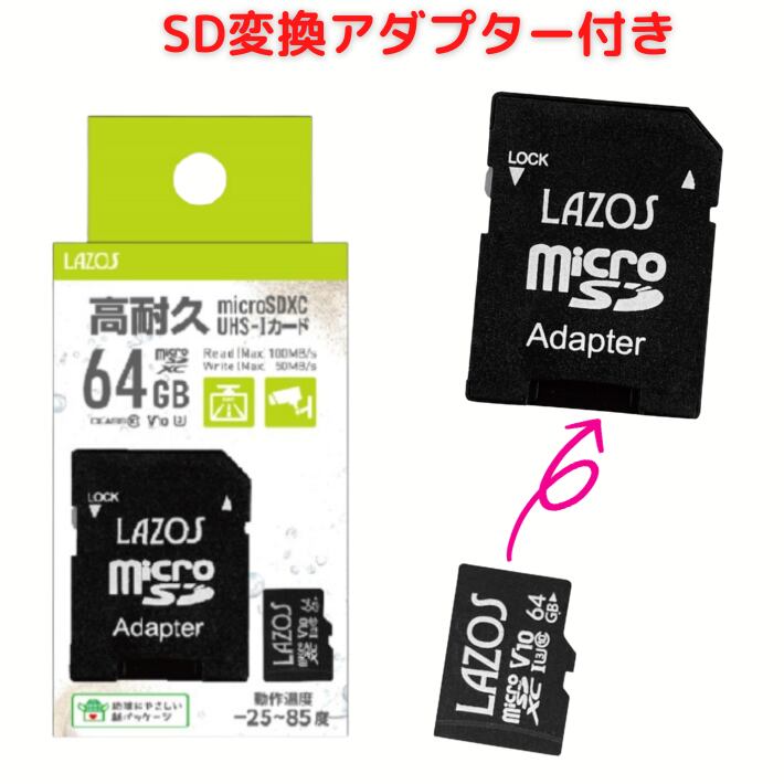 LAZOS 高耐久 マイクロSDカード 64GB UHS-I CLASS10 メモリーカード Nintendo Switch ニンテンドー3DS 任天堂 スイッチ ドライブレコーダー デジタルカメラ ビデオカメラ microSDカード microSDカード アダプター付 ギャラクシー アンドロイド スマートフォン スマホ 対応