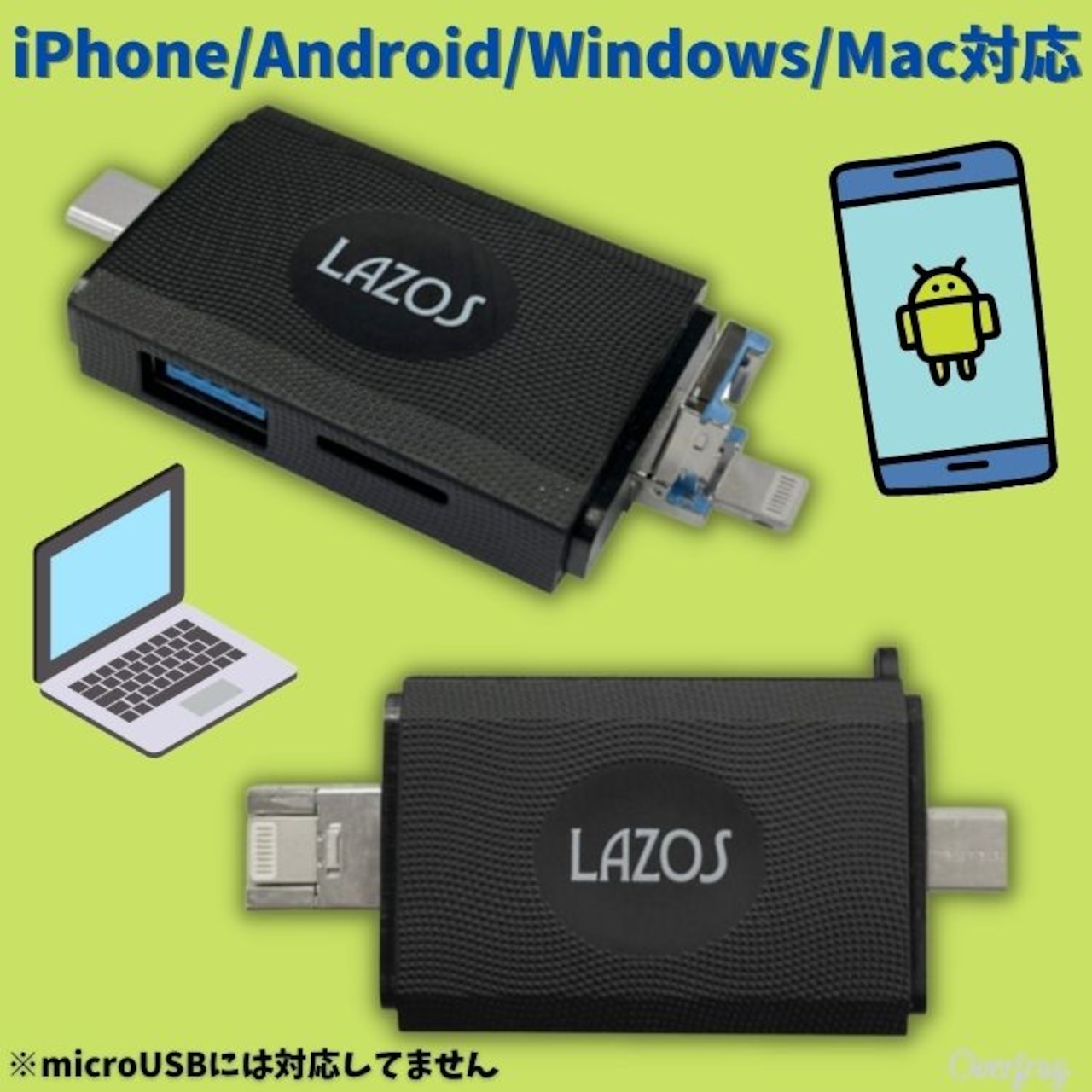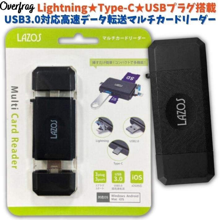 Lazos スマホ マルチカードリーダー OTG Lightning Type-C USBプラグ USB3.0 高速転送 高速データー転送 SDカード microSDカード USBメモリー USB2.0 iPhone iPad PC Android Windows Mac ノートパソコン タブレット カメラ カードリーダー 機種変更 データー移行 テレワーク 送料無料