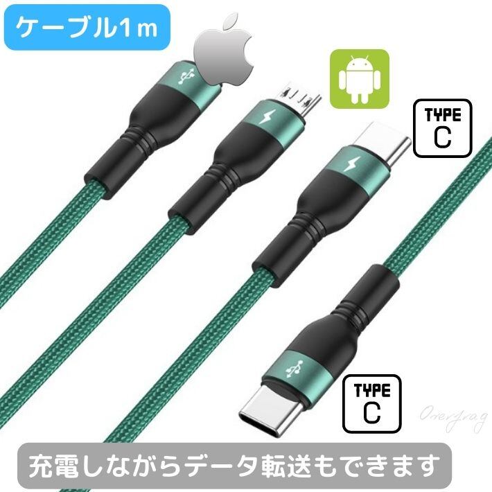 Type-C to C + android iPhone 充電ケーブル 3in1 1m 3台同時 5A 高速 急速充電 断線しにくい 高耐久 ナイロン スリムケーブル アルミ合金端子 アイフォン micro Xperia Galaxy oppo iPad Pro MacBook switch iqos モバイルバッテリー対応 データ転送